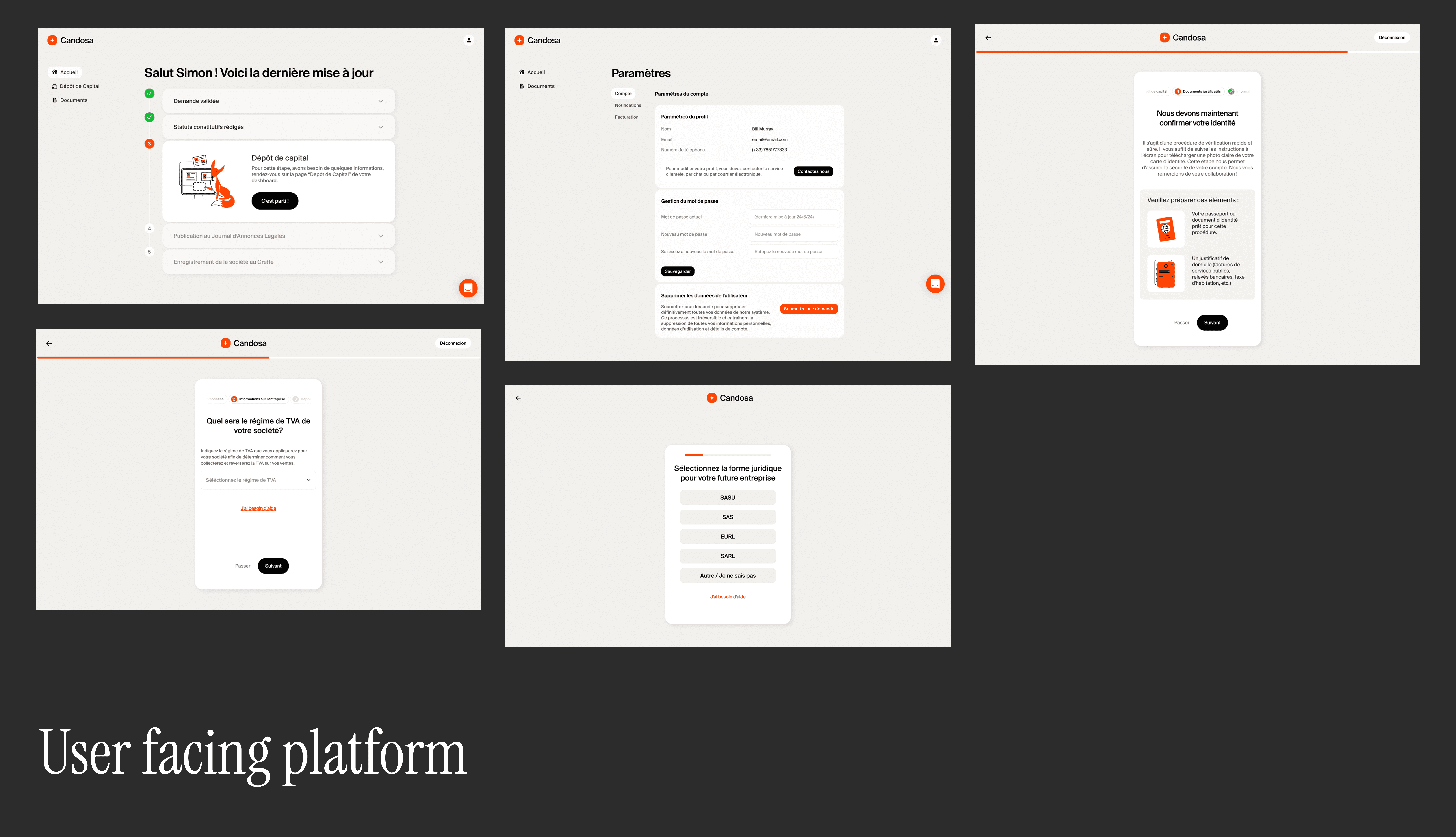 The Client App: A step-by-step interface guiding the entrepreneur in the process of company creation.